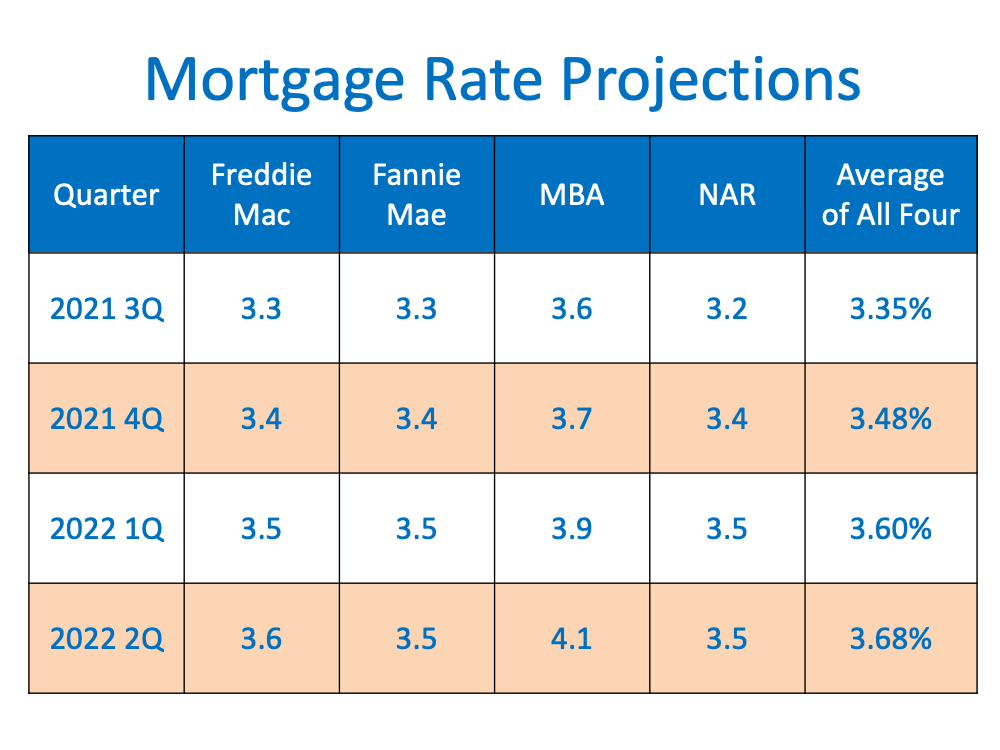 “We forecast that mortgage rates will continue to rise through the end of next year. We estimate the 30-year fixed mortgage rate will average 3.4% in the fourth quarter of 2021, rising to 3.8% in the fourth quarter of 2022.”