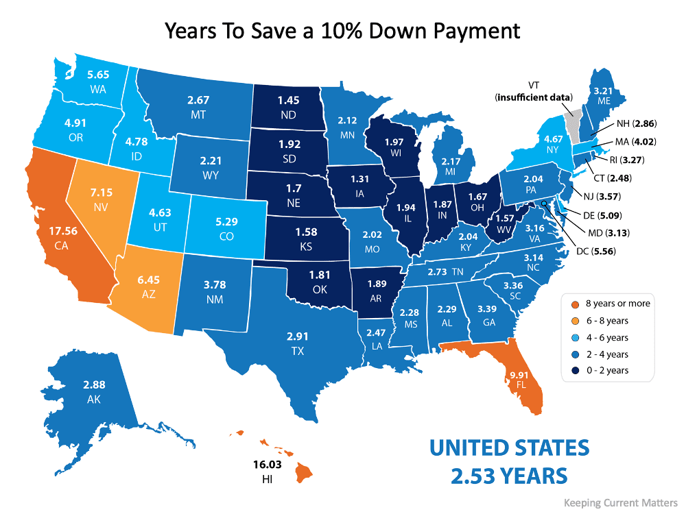 What if you’re able to take advantage of one of the 3% down payment programs available? It’s a common misconception that you need a 20% down payment to buy a home, but there are actually more affordable options and down payment assistance programs available, especially for first-time buyers. The reality is, saving for a 3% down payment may not take several years. In fact, it could take less than a year in most states, as shown in the map below: