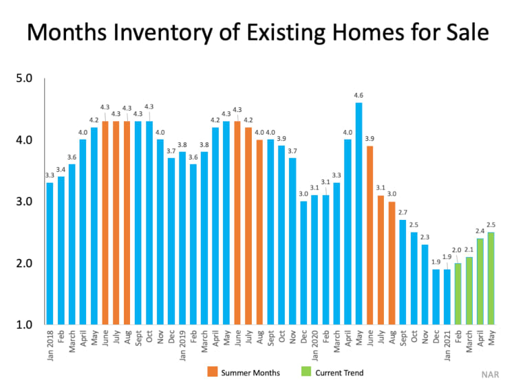 According to the latest Existing Home Sales Report from the National Association of REALTORS® (NAR), inventory levels have been rising since February of this year. Looking at the graph below, there’s a clear upward trend, as shown in the green bars. Currently, there’s roughly a 2.5 months’ supply of homes for sale. And while inventory is trending up as more houses are coming to the market, it’s still much lower than several of the previous summers, as the orange bars indicate.